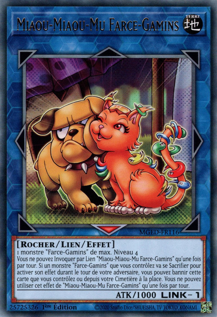 Vous ne pouvez Invoquer par Lien "Miaou-Miaou-Mu Farce-Gamins" qu'une fois par tour. Si un monstre "Farce-Gamins" que vous contrôlez va se Sacrifier pour activer son effet durant le tour de votre adversaire, vous pouvez bannir cette carte que vous contrôlez ou depuis votre Cimetière à la place. Vous ne pouvez utiliser cet effet de "Miaou-Miaou-Mu Farce-Gamins" qu'une fois par tour.