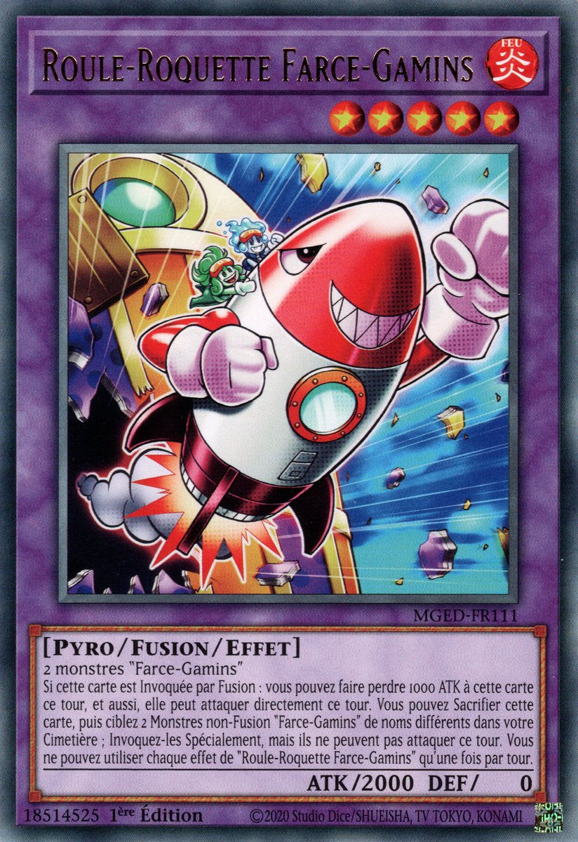Si cette carte est Invoquée par Fusion : vous pouvez faire perdre 1000 ATK à cette carte ce tour, et aussi, elle peut attaquer directement ce tour. Vous pouvez Sacrifier cette carte, puis ciblez 2 Monstres non-Fusion "Farce-Gamins" de noms différents dans votre Cimetière ; Invoquez-les Spécialement, mais ils ne peuvent pas attaquer ce tour. Vous ne pouvez utiliser chaque effet de "Roule-Roquette Farce-Gamins" qu'une fois par tour.