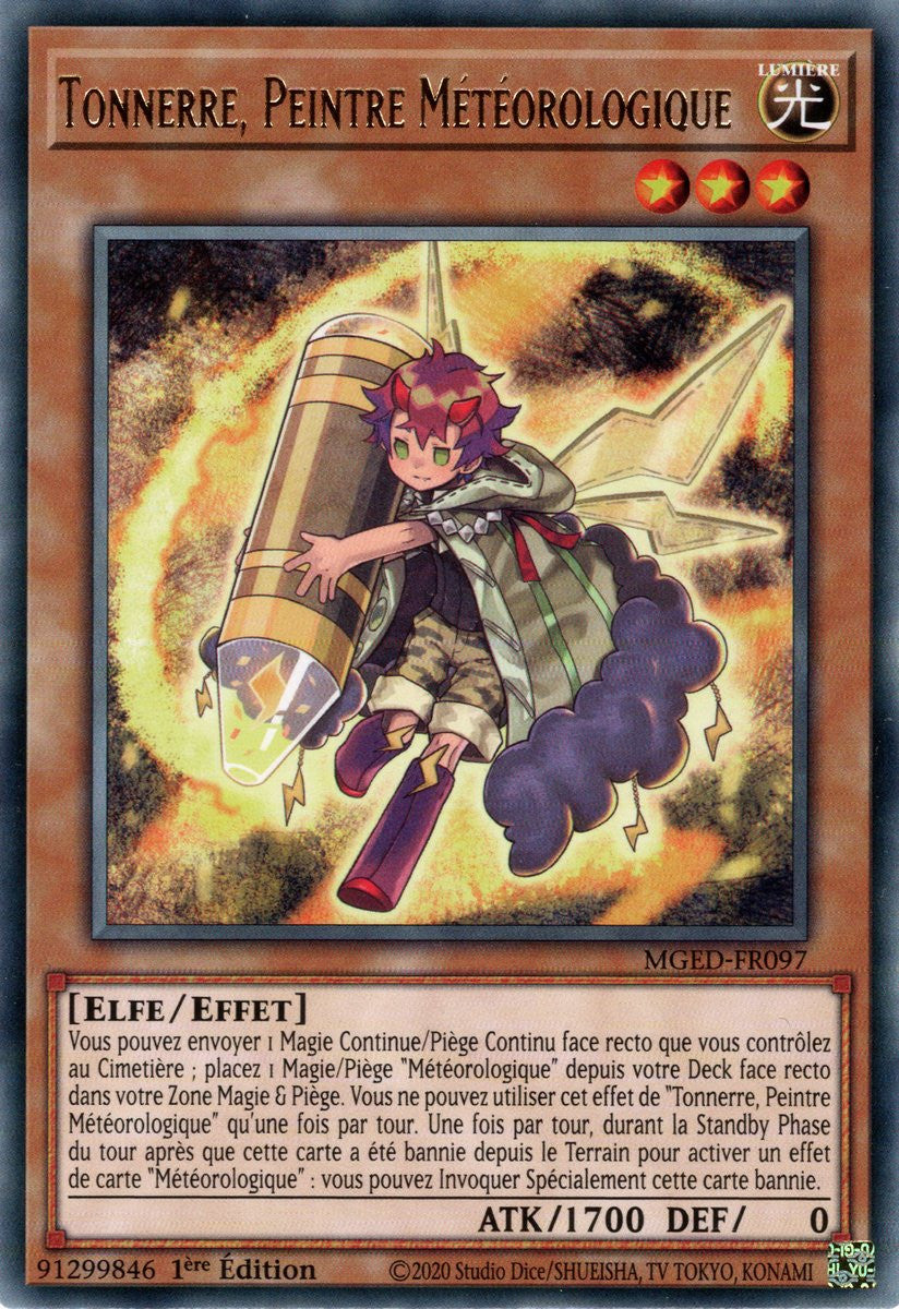 Vous pouvez envoyer 1 Magie Deny/Piège Continu face recto que vous contrôlez au Cimetière ; placez 1 Magie/Piège "Météorologique" depuis votre Deck face recto dans votre Zone Magie & Piège. Vous ne pouvez utiliser cet effet de "Tonnerre, Peintre Météorologique" qu'une fois par tour. Une fois par tour, durant la Standby Phase du tour après que cette carte a été bannie depuis le Terrain pour activer un effet de carte "Météorologique" : vous pouvez Invoquer Spécialement cette carte bannie.