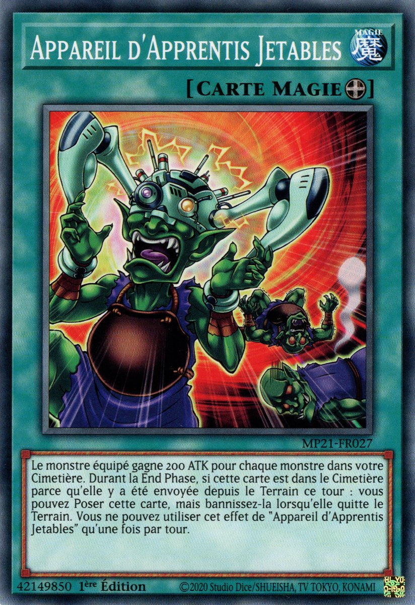 Le monstre équipé gagne 200 ATK pour chaque monstre dans votre Cimetière. Durant la End Phase, si cette carte est dans le Cimetière parce qu'elle y a été envoyée depuis le Terrain ce tour : vous pouvez Poser cette carte, mais bannissez-la lorsqu'elle quitte le Terrain. Vous ne pouvez utiliser cet effet de "Appareil d'Apprentis Jetables" qu'une fois par tour.
