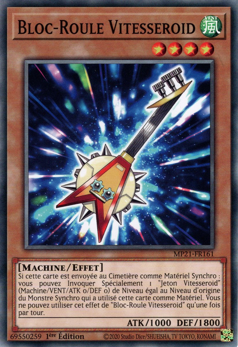 Si cette carte est envoyée au Cimetière comme Matériel Synchro : vous pouvez Invoquer Spécialement 1 "Jeton Vitesseroid" (Machine/VENT/ATK 0/DEF 0) de Niveau égal au Niveau d'origine du Monstre Synchro qui a utilisé cette carte comme Matériel. Vous ne pouvez utiliser cet effet de "Bloc-Roule Vitesseroid" qu'une fois par tour.