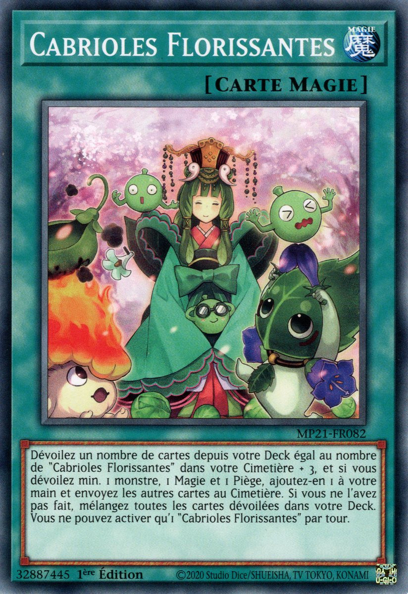 Dévoilez un nombre de cartes du dessus de votre Deck égal au nombre de "Cabrioles Florissantes" dans votre Cimetière + 3, et si vous dévoilez min. 1 monstre, 1 Magie et 1 Piège, ajoutez-en 1 à votre main et envoyez les autres cartes au Cimetière. Si vous ne l'avez pas fait, mélangez toutes les cartes dévoilées dans votre Deck. Vous ne pouvez activer qu'1 "Cabrioles Florissantes" par tour.