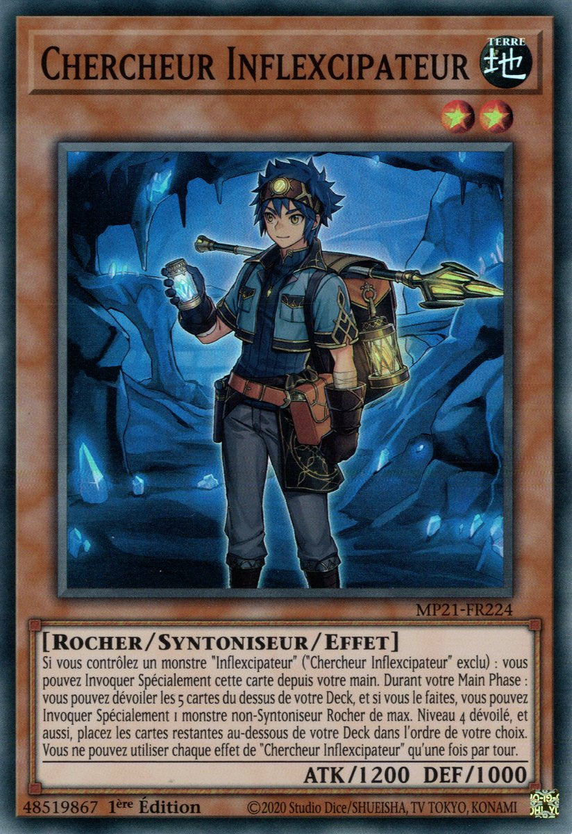 Si vous contrôlez un monstre "Inflexcipateur" ("Chercheur Inflexcipateur" exclu) : vous pouvez Invoquer Spécialement cette carte depuis votre main. Durant votre Main Phase : vous pouvez dévoiler les 5 cartes du dessus de votre Deck, et si vous le faites, vous pouvez Invoquer Spécialement 1 monstre non-Syntoniseur Rocher de max. Niveau 4 dévoilé, et aussi, placez les cartes restantes au-dessous de votre Deck dans l'ordre de votre choix. Vous ne pouvez utiliser chaque effet de "Chercheur Inflexcipateur" qu'une fois par tour.
