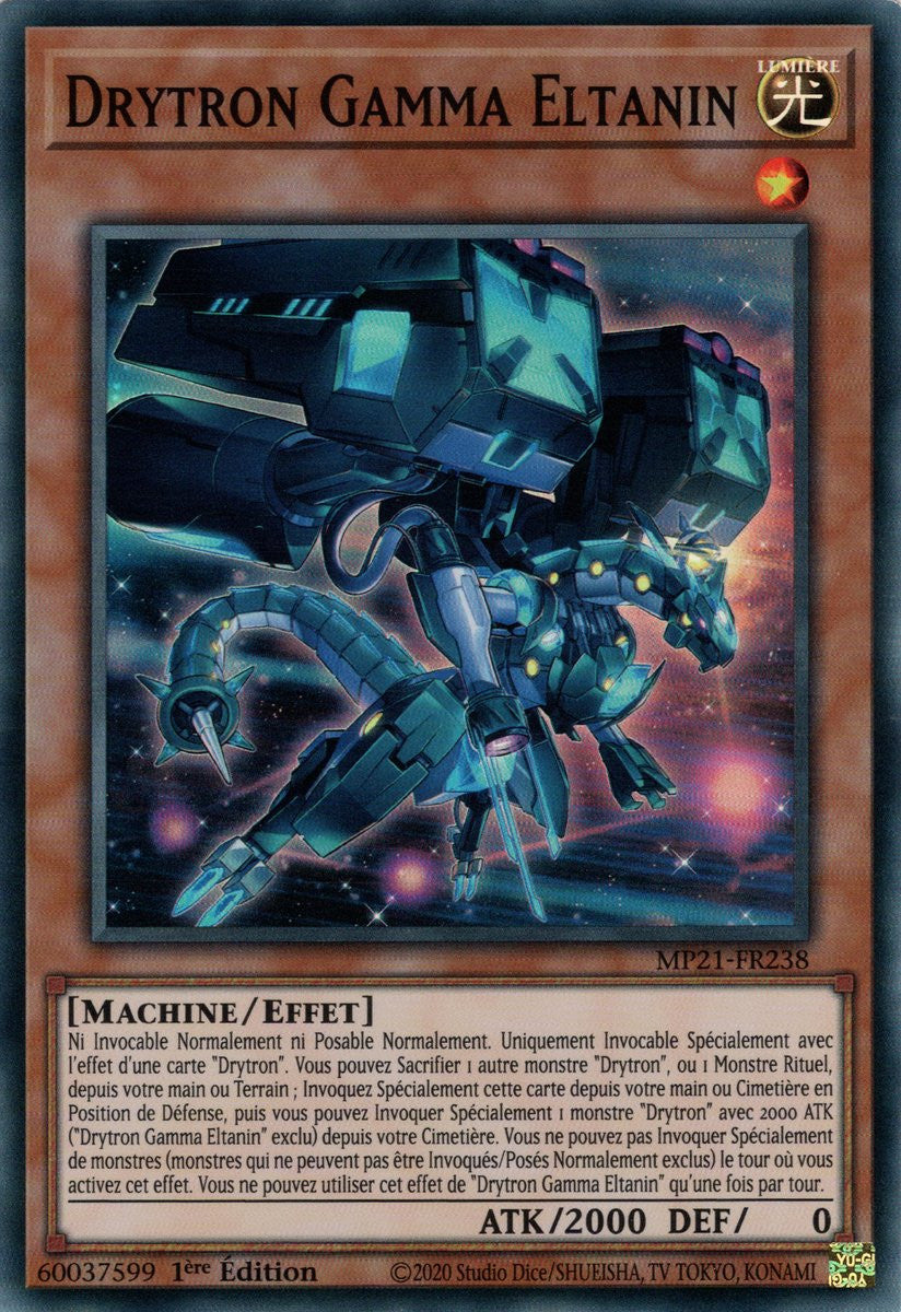 Ni Invocable Normalement ni Posable Normalement. Uniquement Invocable Spécialement avec l'effet d'une carte "Drytron". Vous pouvez Sacrifier 1 autre monstre "Drytron", ou 1 Monstre Rituel, depuis votre main ou Terrain ; Invoquez Spécialement cette carte depuis votre main ou Cimetière en Position de Défense, puis vous pouvez Invoquer Spécialement 1 monstre "Drytron" avec 2000 ATK ("Drytron Gamma Eltanin" exclu) depuis votre Cimetière. Vous ne pouvez pas Invoquer Spécialement de monstres (monstres qui ne peuvent pas être Invoqués/Posés Normalement exclus) le tour où vous activez cet effet. Vous ne pouvez utiliser cet effet de "Drytron Gamma Eltanin" qu'une fois par tour.