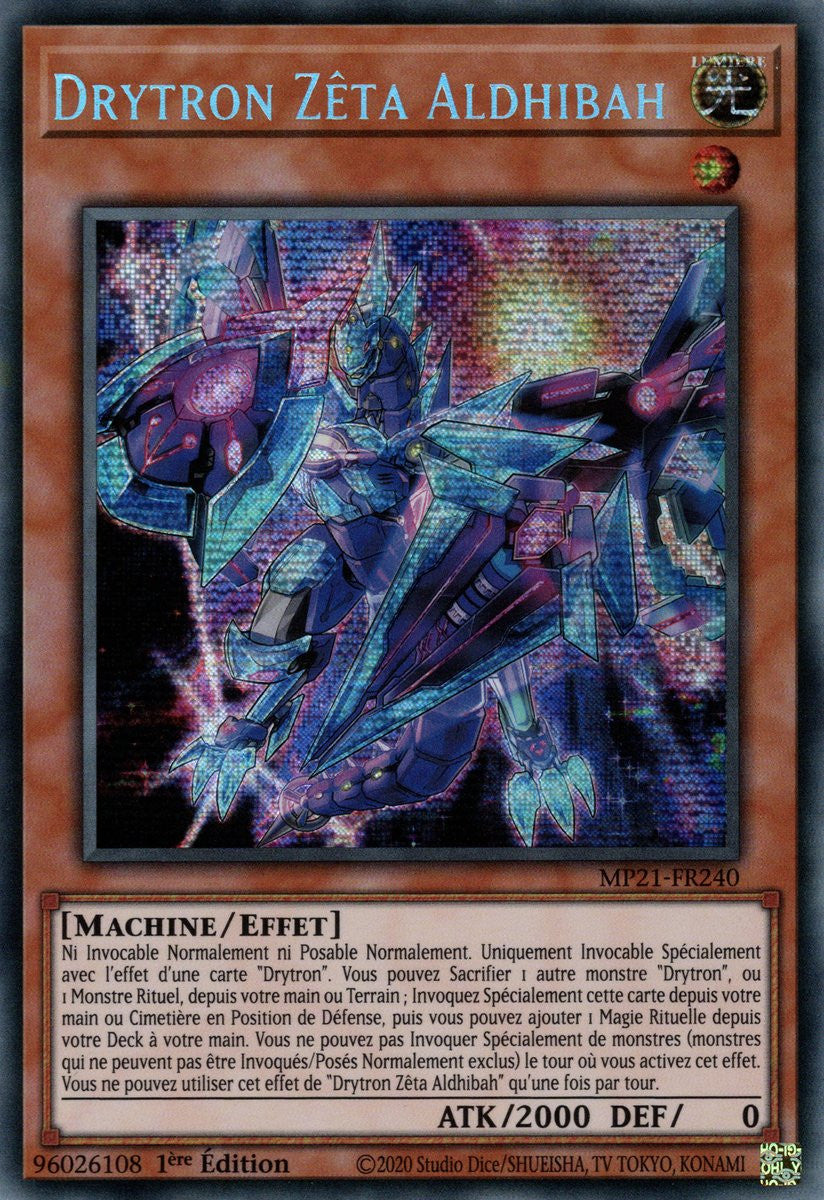 Ni Invocable Normalement ni Posable Normalement. Uniquement Invocable Spécialement avec l'effet d'une carte "Drytron". Vous pouvez Sacrifier 1 autre monstre "Drytron", ou 1 Monstre Rituel, depuis votre main ou Terrain ; Invoquez Spécialement cette carte depuis votre main ou Cimetière en Position de Défense, puis vous pouvez ajouter 1 Magie Rituelle depuis votre Deck à votre main. Vous ne pouvez pas Invoquer Spécialement de monstres (monstres qui ne peuvent pas être Invoqués/Posés Normalement exclus) le tour où vous activez cet effet. Vous ne pouvez utiliser cet effet de "Drytron Zêta Aldhibah" qu'une fois par tour.