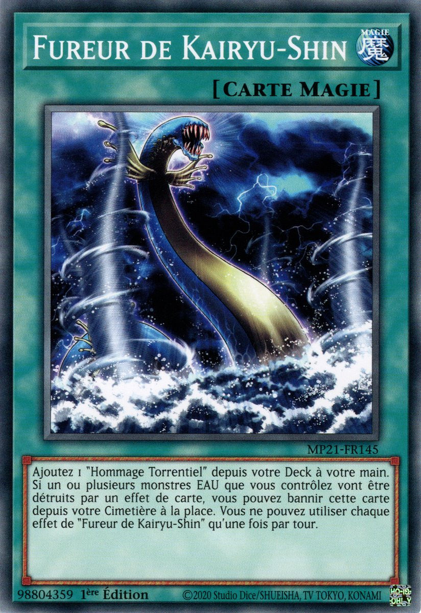 Ajoutez 1 "Hommage Torrentiel" depuis votre Deck à votre main. Si un ou plusieurs monstres EAU que vous contrôlez vont être détruits par un effet de carte, vous pouvez bannir cette carte depuis votre Cimetière à la place. Vous ne pouvez utiliser chaque effet de "Fureur de Kairyu-Shin" qu'une fois par tour.