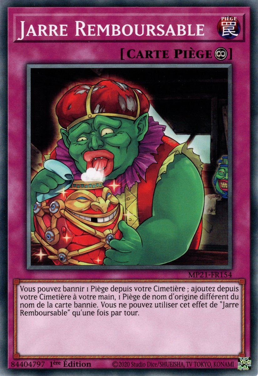 Vous pouvez bannir 1 Piège depuis votre Cimetière ; ajoutez depuis votre Cimetière à votre main, 1 Piège de nom d'origine différent du nom de la carte bannie. Vous ne pouvez utiliser cet effet de "Jarre Remboursable" qu'une fois par tour.