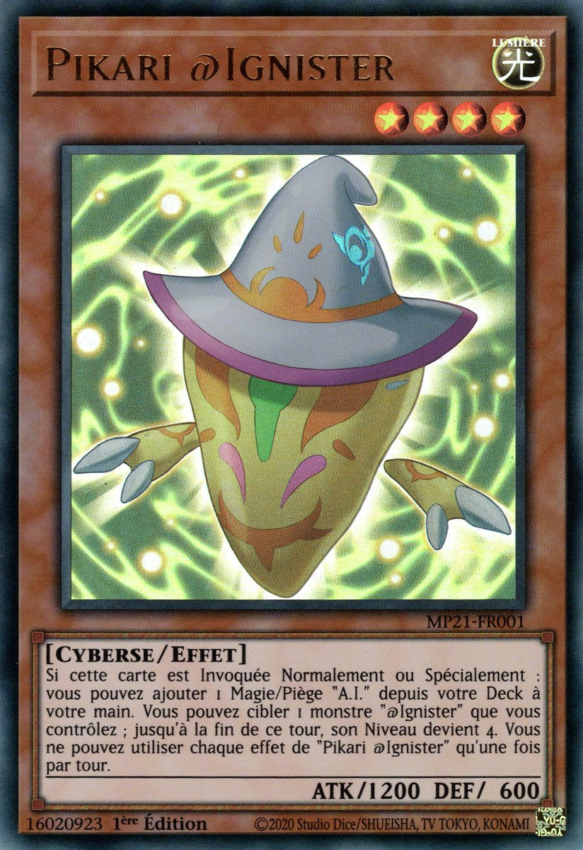 Si cette carte est Invoquée Normalement ou Spécialement : vous pouvez ajouter 1 Magie/Piège "A.I." depuis votre Deck à votre main. Vous pouvez cibler 1 monstre "@Ignister" que vous contrôlez ; jusqu'à la fin de ce tour, son Niveau devient 4. Vous ne pouvez utiliser chaque effet de "Pikari @Ignister" qu'une fois par tour.