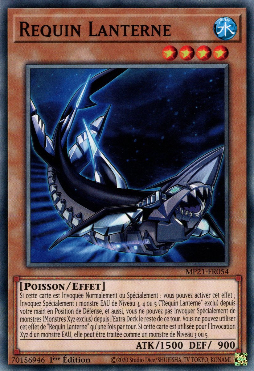 Si cette carte est Invoquée Normalement ou Spécialement : vous pouvez activer cet effet ; Invoquez Spécialement 1 monstre EAU de Niveau 3, 4 ou 5 ("Requin Lanterne" exclu) depuis votre main en Position de Défense, et aussi, vous ne pouvez pas Invoquer Spécialement de monstres (Monstres Xyz exclus) depuis l'Extra Deck le reste de ce tour. Vous ne pouvez utiliser cet effet de "Requin Lanterne" qu'une fois par tour. Si cette carte est utilisée pour l'Invocation Xyz d'un monstre EAU, elle peut être traitée comme un monstre de Niveau 3 ou 5.