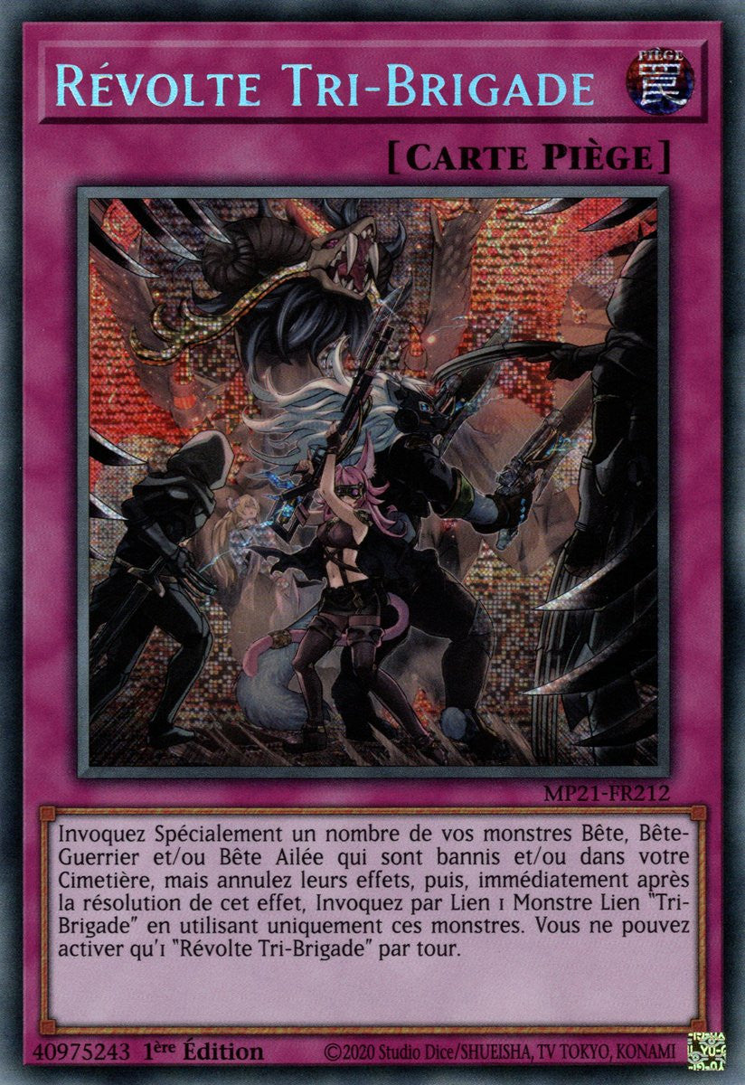 Invoquez Spécialement un nombre de vos monstres Bête, Bête-Guerrier et/ou Bête Ailée qui sont bannis et/ou dans votre Cimetière, mais annulez leurs effets, puis, immédiatement après la résolution de cet effet, Invoquez par Lien 1 Monstre Lien "Tri-Brigade" en utilisant uniquement ces monstres. Vous ne pouvez activer qu'1 "Révolte Tri-Brigade" par tour.