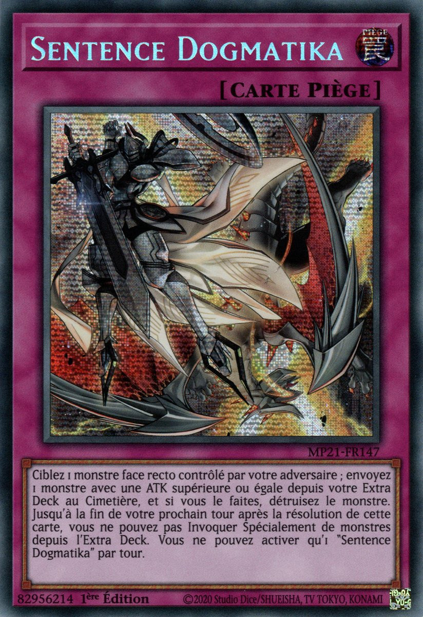 Ciblez 1 monstre face recto contrôlé par votre adversaire ; envoyez 1 monstre avec une ATK supérieure ou égale depuis votre Extra Deck au Cimetière, et si vous le faites, détruisez le monstre. Jusqu'à la fin de votre prochain tour après la résolution de cette carte, vous ne pouvez pas Invoquer Spécialement de monstres depuis l'Extra Deck. Vous ne pouvez activer qu'1 "Sentence Dogmatika" par tour.