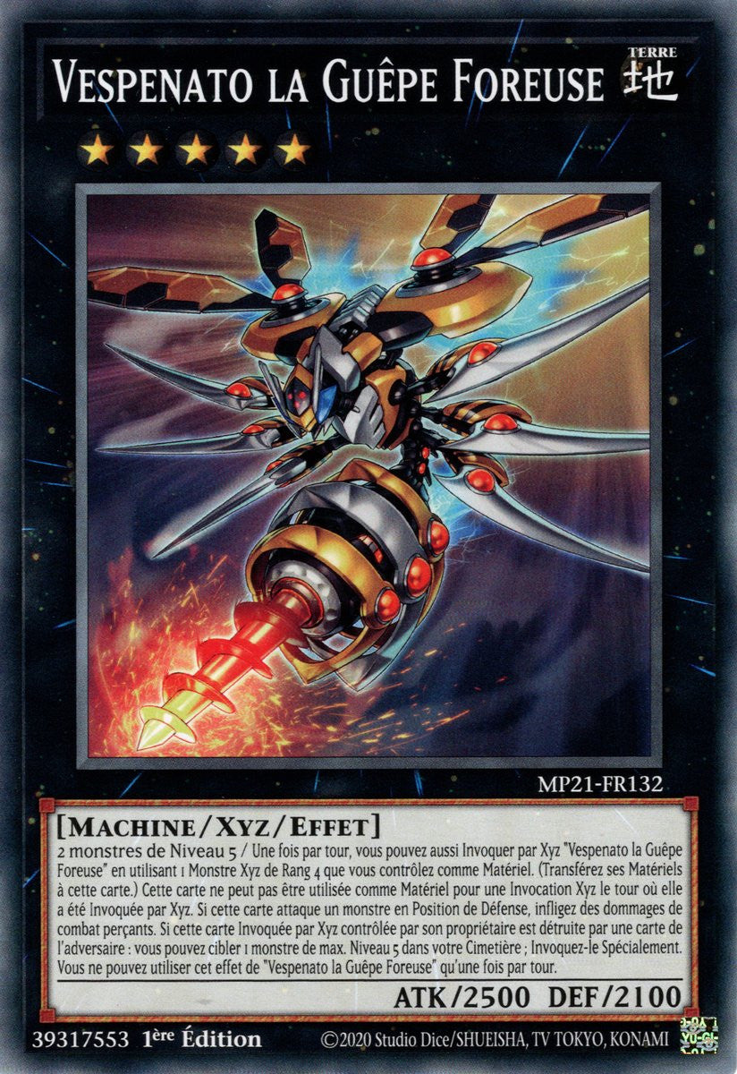 Une fois par tour, vous pouvez aussi Invoquer par Xyz "Vespenato la Guêpe Foreuse" en utilisant 1 Monstre Xyz de Rang 4 que vous contrôlez comme Matériel. (Transférez ses Matériels à cette carte.) Cette carte ne peut pas être utilisée comme Matériel pour une Invocation Xyz le tour où elle a été Invoquée par Xyz. Si cette carte attaque un monstre en Position de Défense, infligez des dommages de combat perçants. Si cette carte Invoquée par Xyz contrôlée par son propriétaire est détruite par une carte de l'adversaire : vous pouvez cibler 1 monstre de max. Niveau 5 dans votre Cimetière ; Invoquez-le Spécialement. Vous ne pouvez utiliser cet effet de "Vespenato la Guêpe Foreuse" qu'une fois par tour.