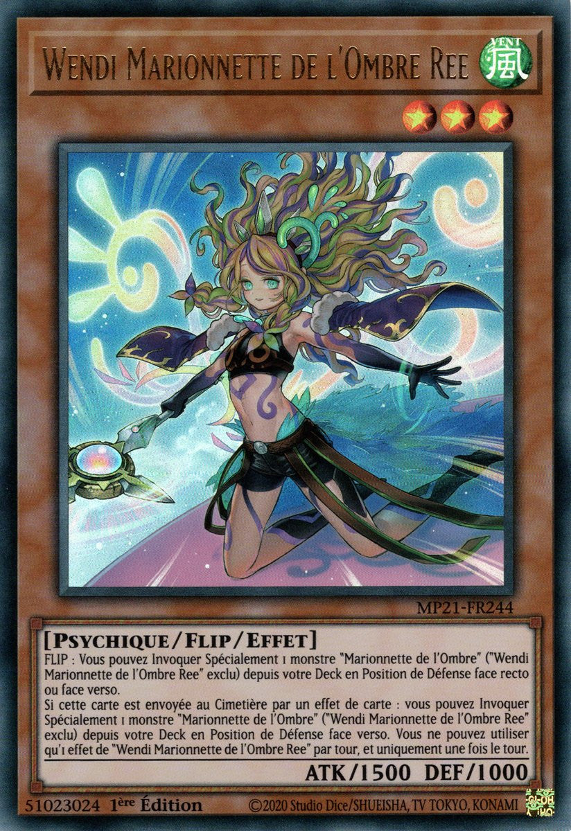 Si cette carte est envoyée au Cimetière par un effet de carte : vous pouvez Invoquer Spécialement 1 monstre "Marionnette de l'Ombre" ("Wendi Marionnette de l'Ombre Ree" exclu) depuis votre Deck en Position de Défense face verso. Vous ne pouvez utiliser qu'1 effet de "Wendi Marionnette de l'Ombre Ree" par tour, et uniquement une fois le tour.