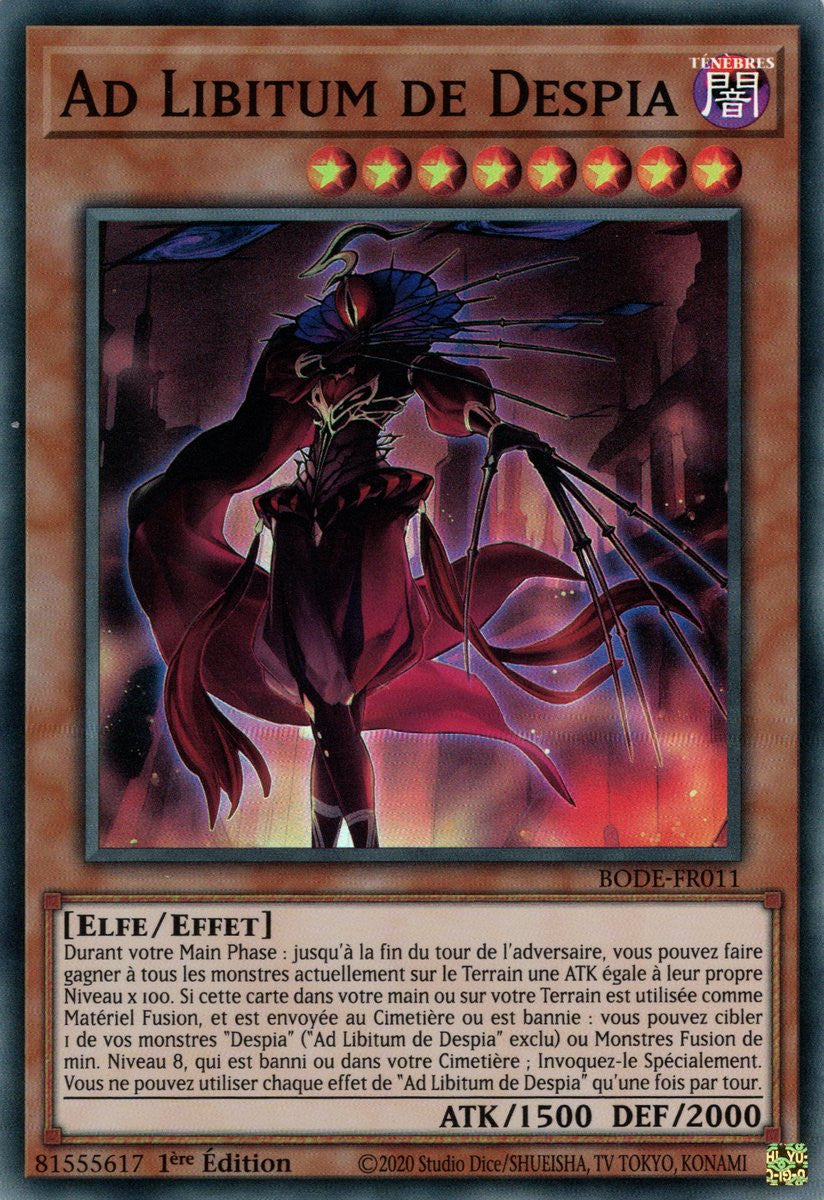 Durant votre Main Phase : jusqu'à la fin du tour de l'adversaire, vous pouvez faire gagner à tous les monstres actuellement sur le Terrain une ATK égale à leur propre Niveau x 100. Si cette carte dans votre main ou sur votre Terrain est utilisée comme Matériel Fusion, et est envoyée au Cimetière ou est bannie : vous pouvez cibler 1 de vos monstres "Despia" ("Ad Libitum de Despia" exclu) ou Monstres Fusion de min. Niveau 8, qui est banni ou dans votre Cimetière ; Invoquez-le Spécialement. Vous ne pouvez utiliser chaque effet de "Ad Libitum de Despia" qu'une fois par tour.