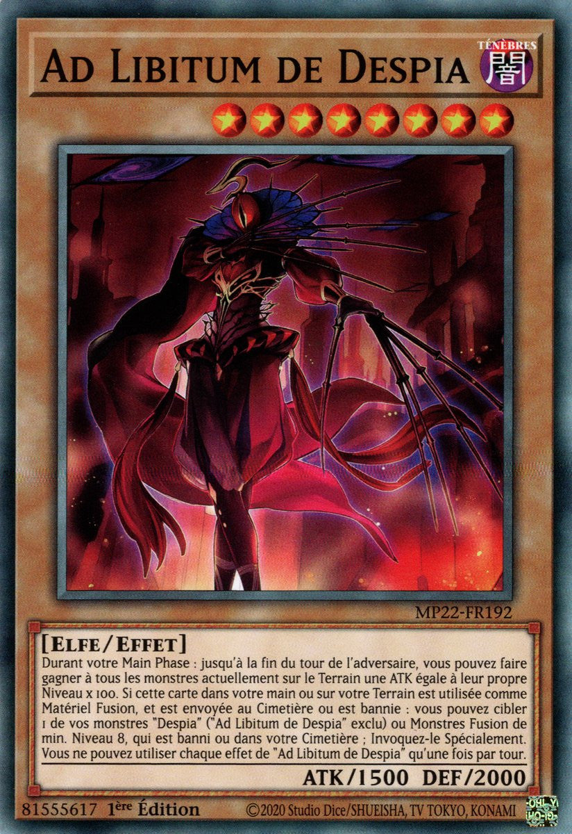 Durant votre Main Phase : jusqu'à la fin du tour de l'adversaire, vous pouvez faire gagner à tous les monstres actuellement sur le Terrain une ATK égale à leur propre Niveau x 100. Si cette carte dans votre main ou sur votre Terrain est utilisée comme Matériel Fusion, et est envoyée au Cimetière ou est bannie : vous pouvez cibler 1 de vos monstres "Despia" ("Ad Libitum de Despia" exclu) ou Monstres Fusion de min. Niveau 8, qui est banni ou dans votre Cimetière ; Invoquez-le Spécialement. Vous ne pouvez utiliser chaque effet de "Ad Libitum de Despia" qu'une fois par tour.
