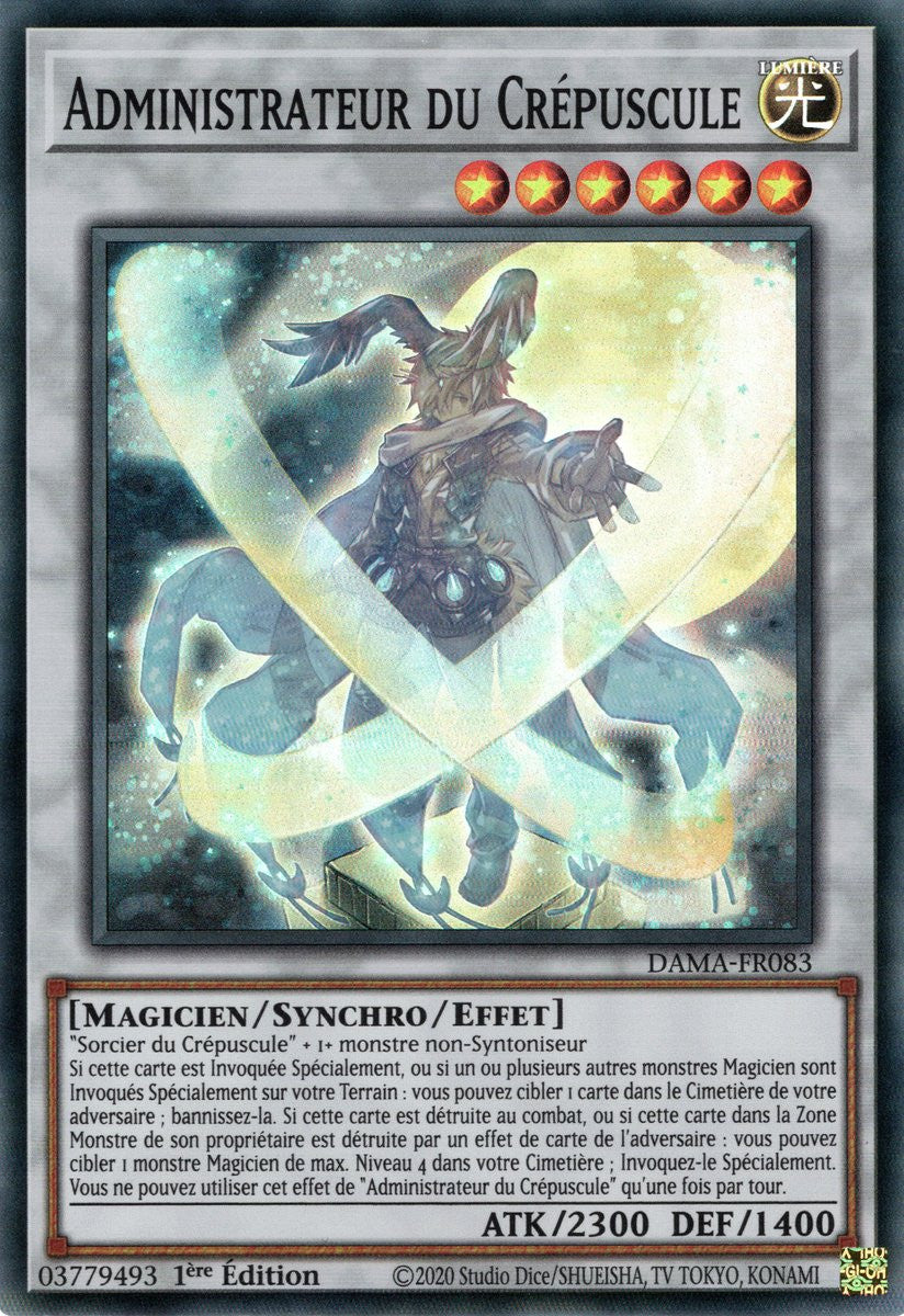 Si cette carte est Invoquée Spécialement, ou si un ou plusieurs autres monstres Magicien sont Invoqués Spécialement sur votre Terrain : vous pouvez cibler 1 carte dans le Cimetière de votre adversaire ; bannissez-la. Si cette carte est détruite au combat, ou si cette carte dans la Zone Monstre de son propriétaire est détruite par un effet de carte de l'adversaire : vous pouvez cibler 1 monstre Magicien de max. Niveau 4 dans votre Cimetière ; Invoquez-le Spécialement. Vous ne pouvez utiliser cet effet de "Administrateur du Crépuscule" qu'une fois par tour.