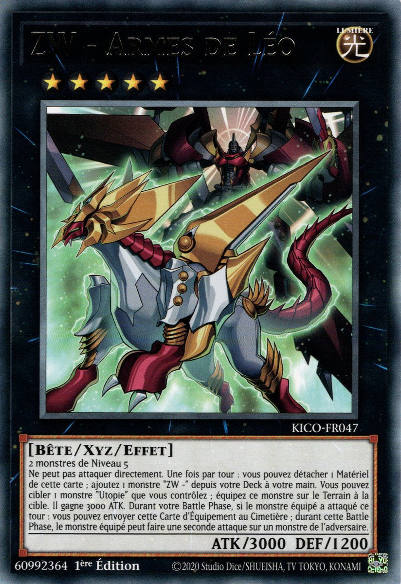 Ne peut pas attaquer directement. Une fois par tour : vous pouvez détacher 1 Matériel de cette carte ; ajoutez 1 monstre "ZW -" depuis votre Deck à votre main. Vous pouvez cibler 1 monstre "Utopie" que vous contrôlez ; équipez ce monstre sur le Terrain à la cible. Il gagne 3000 ATK. Durant votre Battle Phase, si le monstre équipé a attaqué ce tour : vous pouvez envoyer cette Carte d'Équipement au Cimetière ; durant cette Battle Phase, le monstre équipé peut faire une seconde attaque sur un monstre de l'adversaire.