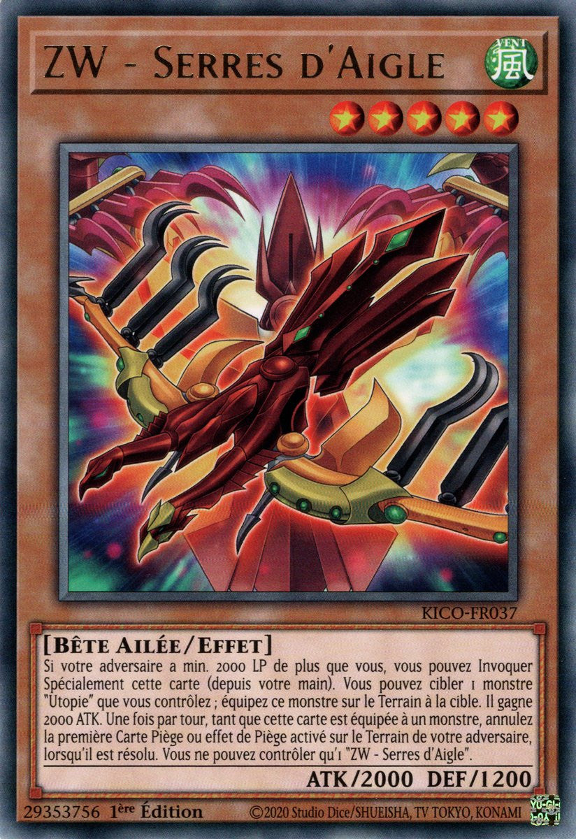 Si votre adversaire a min. 2000 LP de plus que vous, vous pouvez Invoquer Spécialement cette carte (depuis votre main). Vous pouvez cibler 1 monstre "Utopie" que vous contrôlez ; équipez ce monstre sur le Terrain à la cible. Il gagne 2000 ATK. Une fois par tour, tant que cette carte est équipée à un monstre, annulez la première Carte Piège ou effet de Piège activé sur le Terrain de votre adversaire, lorsqu'il est résolu. Vous ne pouvez contrôler qu'1 "ZW - Serres d'Aigle".